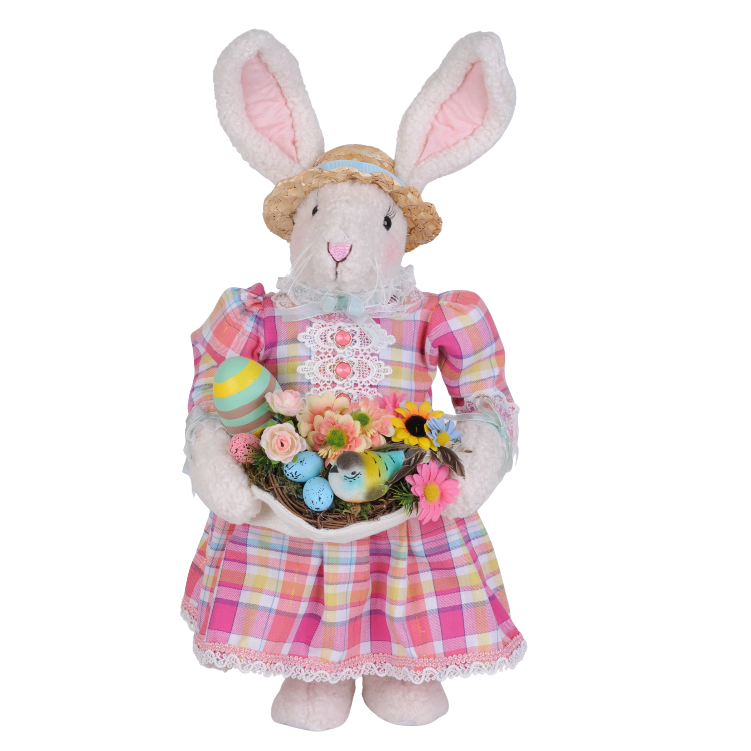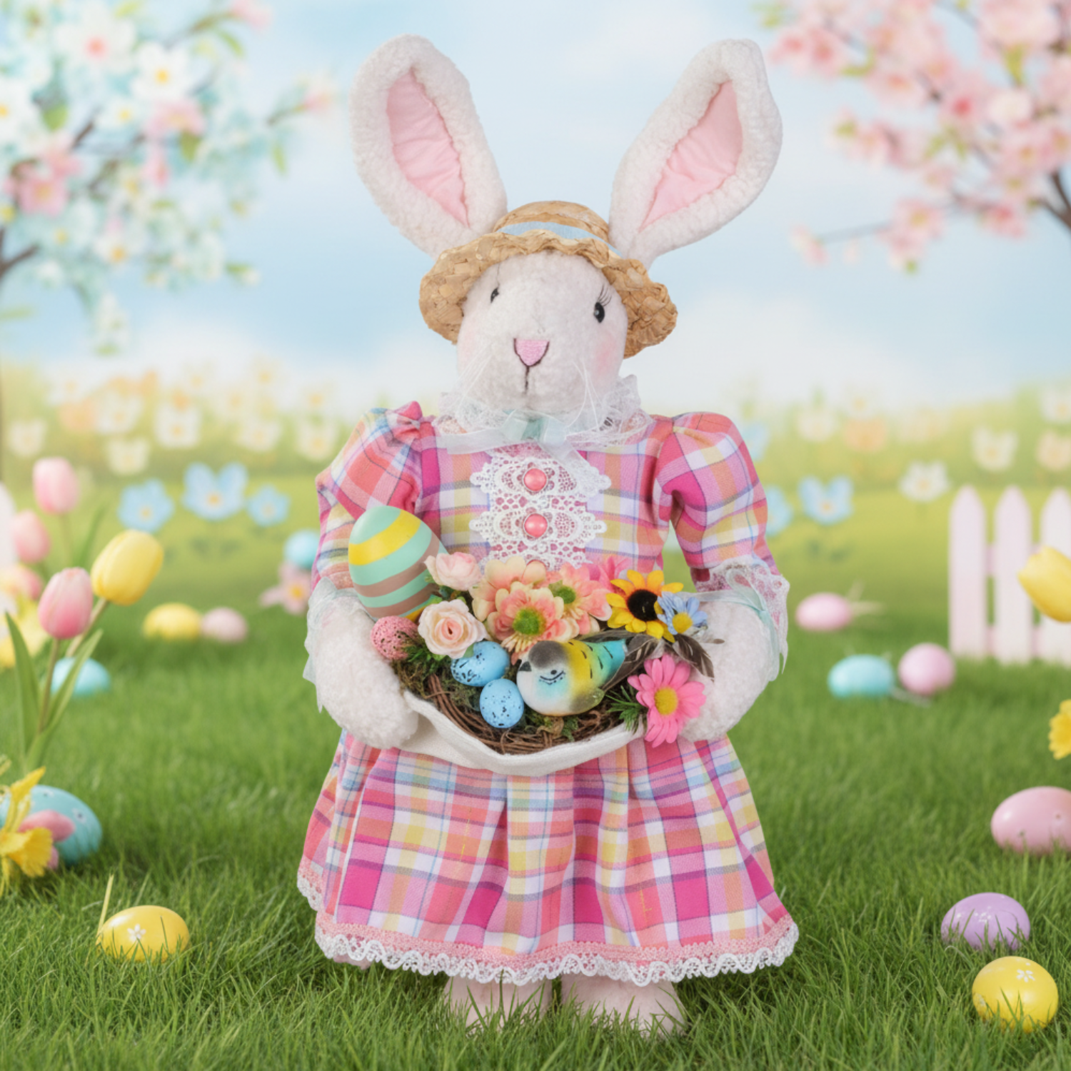 Bird Nest Bunny boasts an irresistibly soft, cuddly exterior paired with a darling country-inspired outfit adorned with elegant lace details. Topped with a precious straw hat and carrying a basket overflowing with cheerful spring treasures, this collectible is bursting with personality. Her distinctive charm and whimsical character transform any space into a cozy springtime haven that'll make you smile every time you see her.