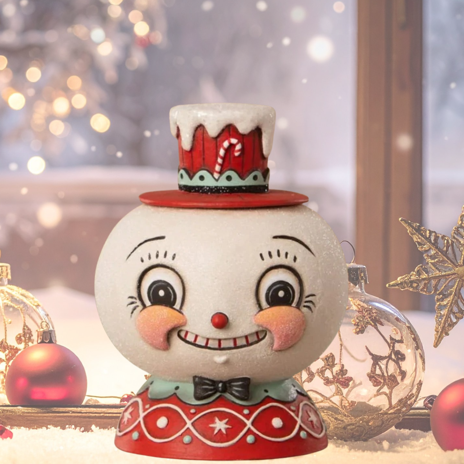 Introducing the Peppermint Snow Beau Container from Johanna Parker's 2025 collection! This dapper fellow sports a striking red top hat that doubles as a removable lid, unveiling a hidden storage compartment inside. Perfect for tucking away holiday candies, small treasures, or festive tokens, this charming snowman brings vintage-inspired whimsy to your seasonal displays. With his cheerful personality and timeless design, Peppermint Snow Beau transforms any space into a cozy winter wonderland while keeping your holiday goodies close at hand.