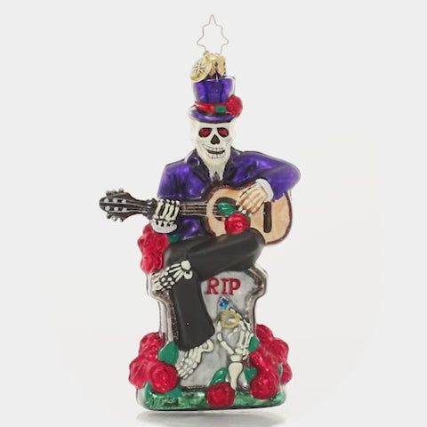 Proof that romance isn't dead…it's undead. A spooky skeleton serenades his beloved beyond with a haunting love song surrounded by blood red roses.