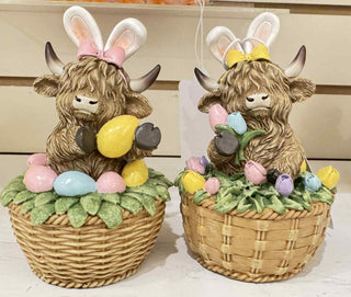 Pre-Order Spring 2026 Resin Easter Highland Cow in a Basket w/Bunny Ears