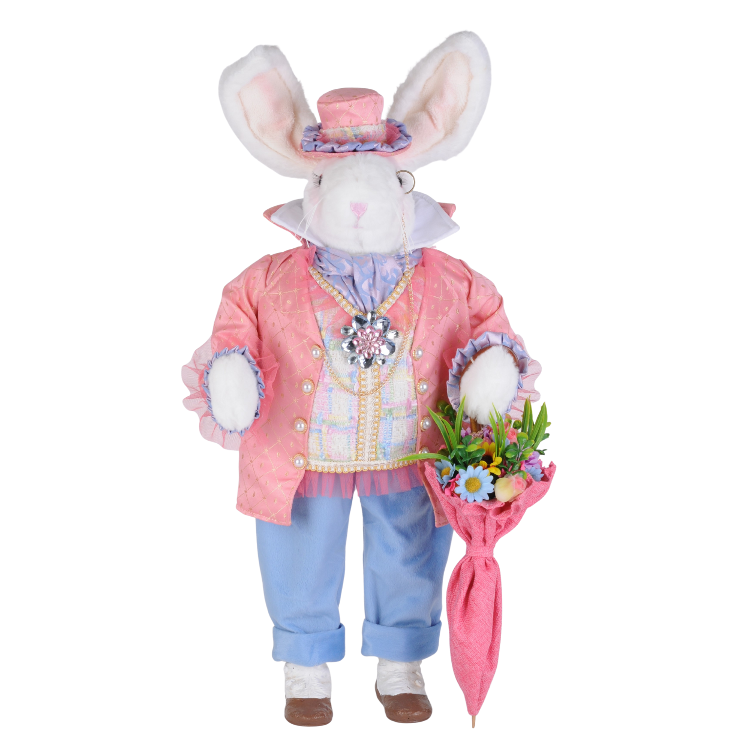 Bring refined charm and springtime elegance to your décor with this distinguished spring bunny figurine, dressed in a polished pastel ensemble inspired by classic storybook style. This handsome bunny wears a tailored pink jacket accented with pearl-like buttons, gold trim, and delicate detailing, layered over a soft tweed-style vest and lavender cravat. A coordinating top hat adds a touch of vintage sophistication, completing his gentlemanly look. In one paw, he holds a bouquet of fresh spring florals wrapped in soft pink fabric, symbolizing renewal and the joy of the season. Plush white fur, softly blushed ears, and thoughtful details such as a jeweled brooch and monocle-style accent give this figurine a charming, heirloom-quality presence. His light blue trousers and lace-up shoes provide a polished finish from head to toe. Perfect for Easter displays, spring vignettes, mantels, or entryway décor, this elegant bunny figurine adds character, warmth, and timeless appeal to any space. A wonderful accent for collectors or anyone who appreciates beautifully detailed seasonal décor designed to be enjoyed year after year.