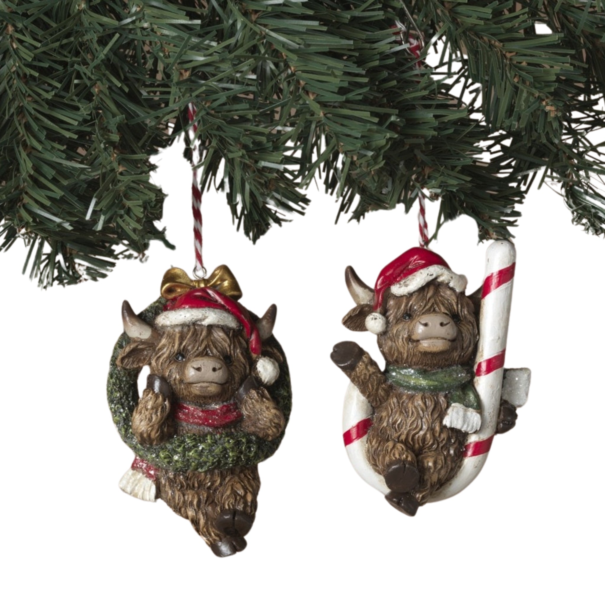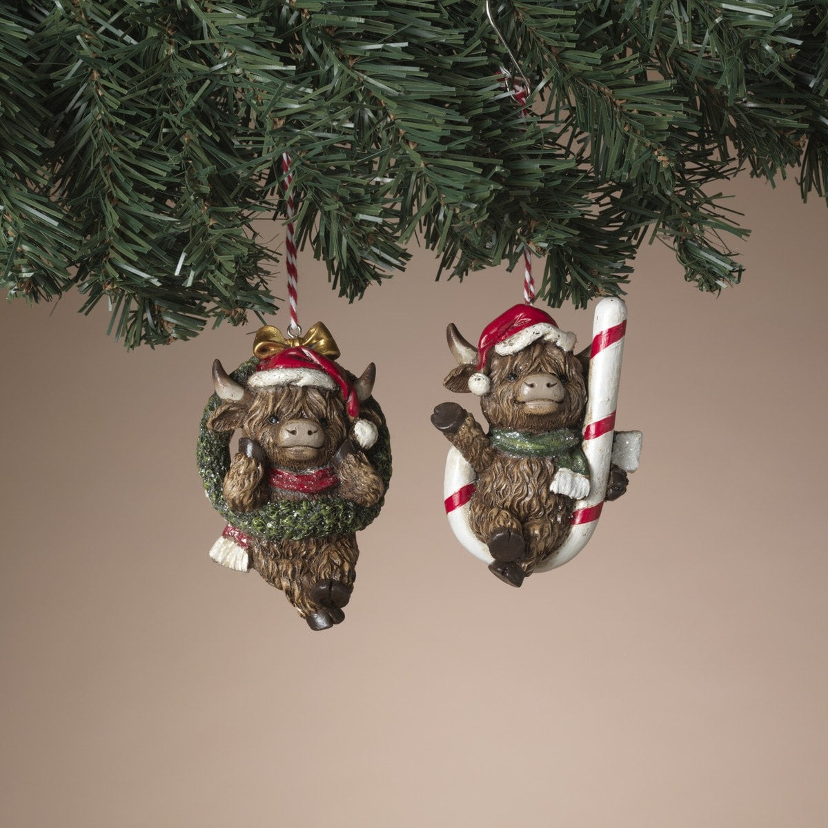 Item Description: 3.7"H Resin Holiday Highland Cow Ornament, 2 Asst