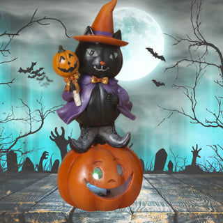 Lighted Folk Art Halloween Black Cat on Pumpkin Figurine 2736840