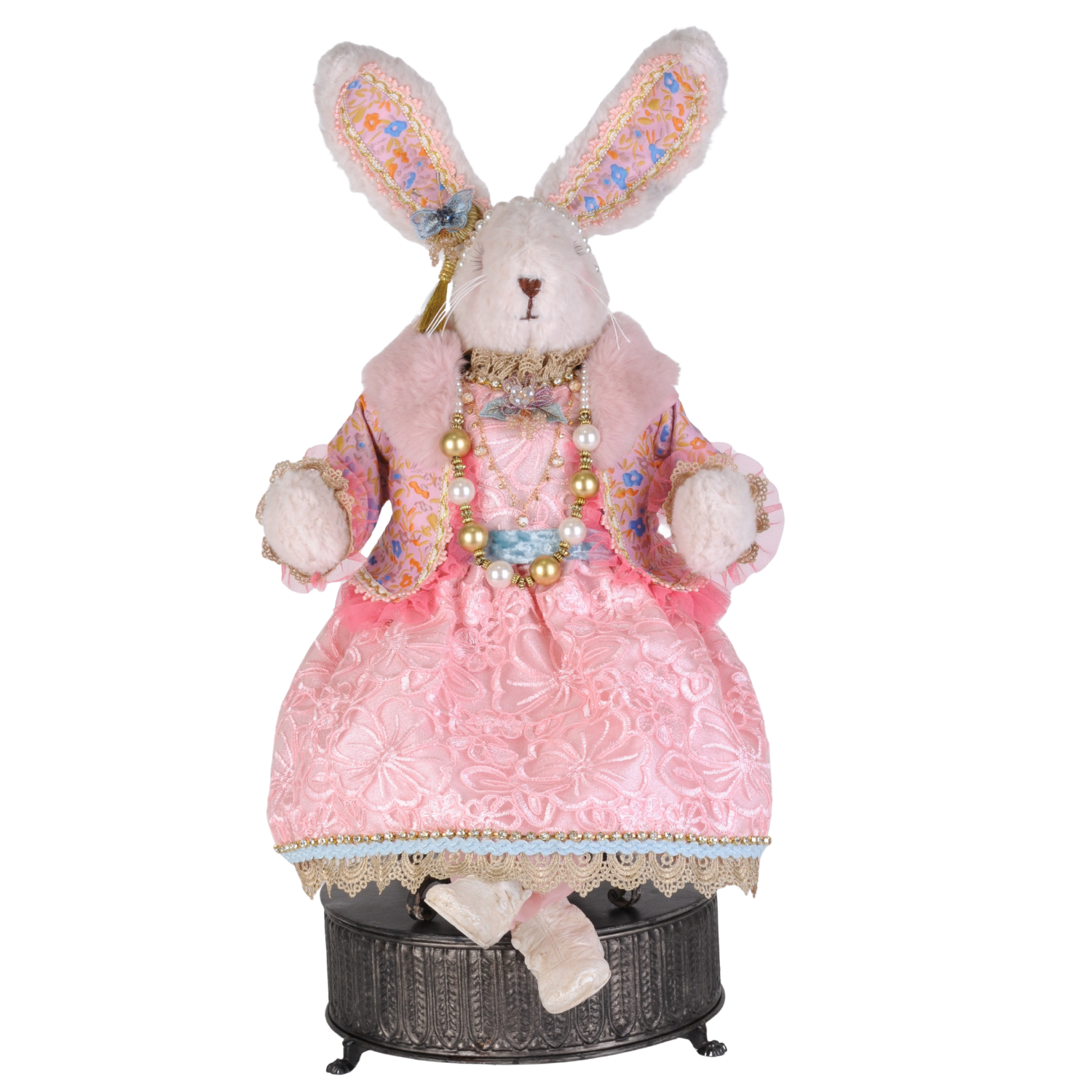 This charming bunny figurine brings spring elegance to any room with its soft blush tones and delicate floral details. Dressed in a beautifully embroidered gown with lace trim and pearl accents, she features adorable fabric-lined ears and refined gold touches. Perfect for Easter displays, spring shelves, or collector showcases, this whimsical bunny adds timeless charm and graceful beauty to your seasonal décor. A delightful treasure for those who love romantic, finely crafted details.