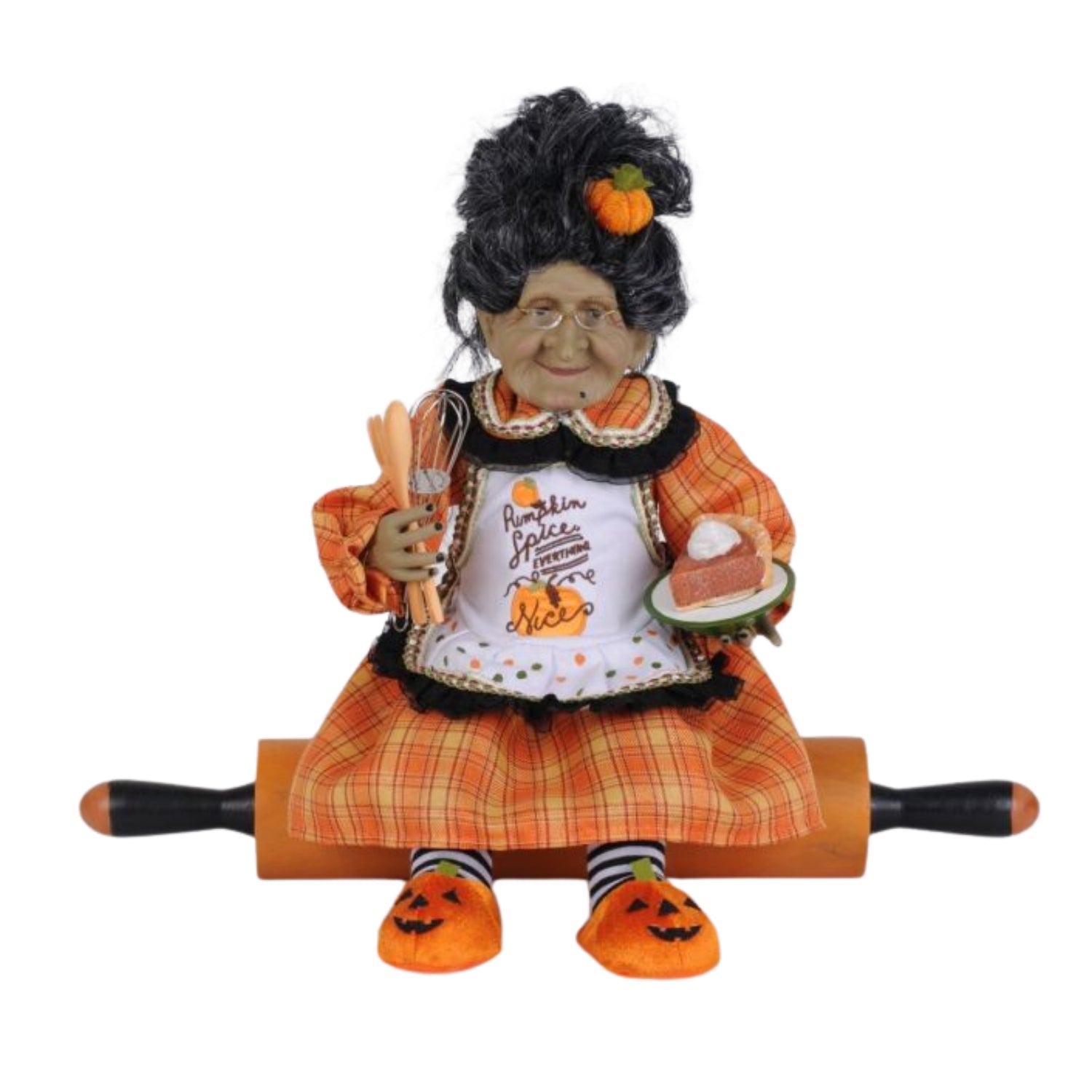 The Pumpkin Spice Granny on Rolling Pin is great for any kitchen or countertop. She is part of the Karen Didion Signature Collection. The quality is unmatched with this decorative piece’s hand-painted face, unique fabrics, and detailed accessories. With this collectible's fun, whimsical design and incredible detail, she's sure to add character and style to any home.