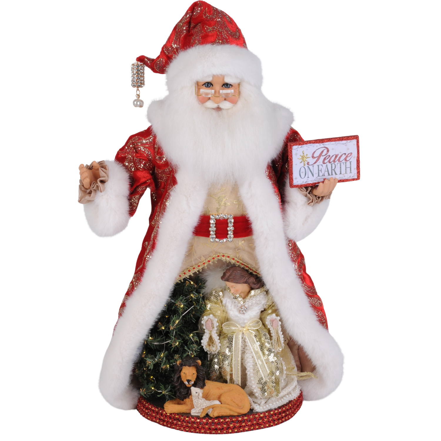 Celebrate the true spirit of Christmas with the beautifully detailed Lighted Peace on Earth Santa Figurine, a touching tribute to the message of hope, love, and serenity. This elegant Santa is dressed in a richly textured red and gold robe trimmed with luxurious white faux fur, holding a sign that reads “Peace on Earth.” But the real magic lies beneath his cloak. Revealed within the folds of his flowing robe is a heartwarming nativity-inspired scene featuring a serene angel in a golden sequin gown beside a decorated Christmas tree, with a peaceful lion and lamb nestled at her feet—symbolizing harmony and divine peace. Perfect as a centerpiece or a spiritual addition to your Christmas collection, the Lighted Peace on Earth Santa Figurine brings a message of calm and kindness that will warm hearts and homes all season long. Takes 2 AA batteries.