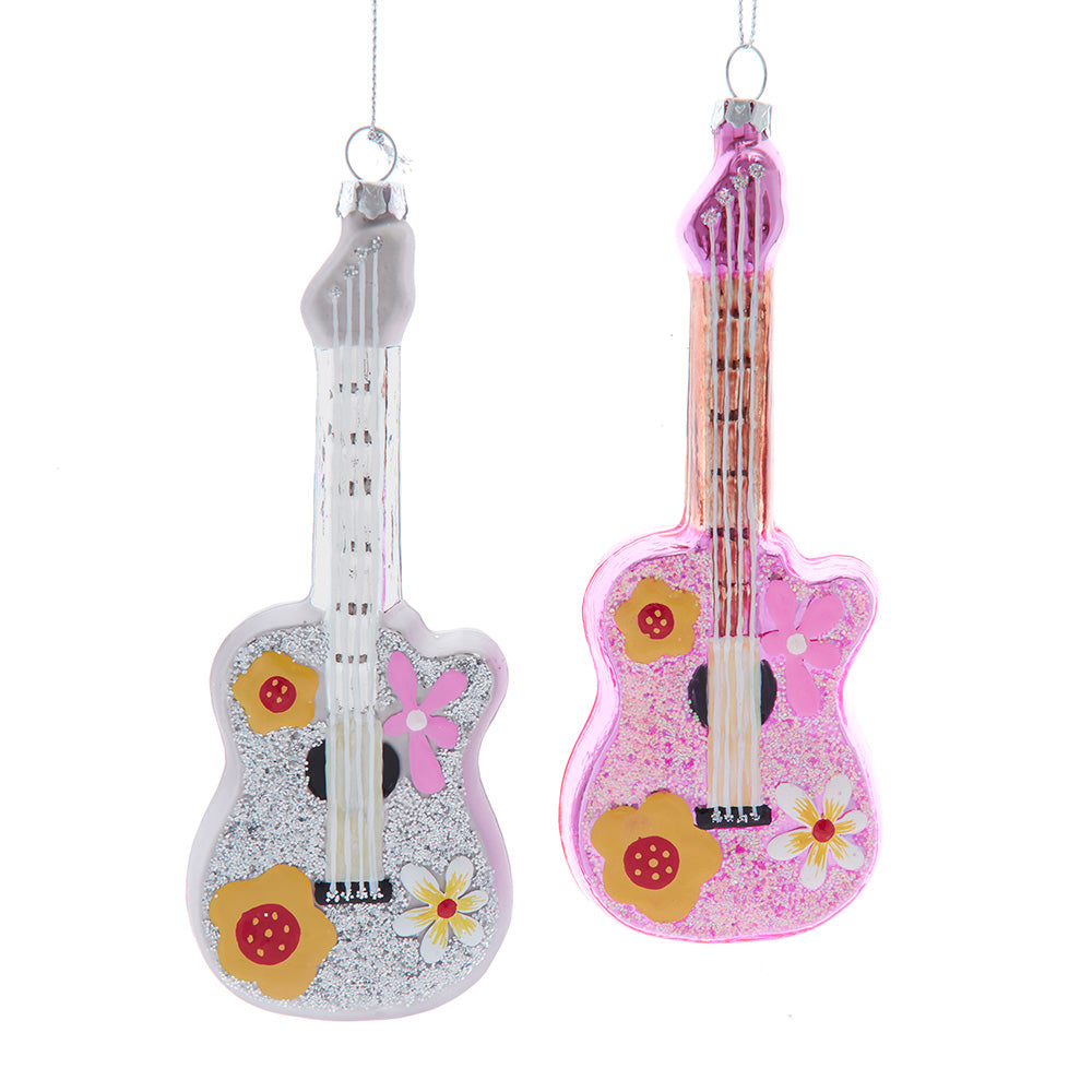 Celebrate your love for music with Kurt Adler's stunning Glass Silver & Pink Guitar Ornament! This eye-catching ornament features a beautifully crafted guitar, adorned in shimmering silver and soft pink hues that will make it a standout piece on your holiday tree. Made from high-quality glass, this ornament showcases intricate detailing, capturing the essence of a classic guitar with a modern twist. Its vibrant colors and elegant design make it a perfect addition to any music lover's holiday decor or a unique gift for the musician in your life.