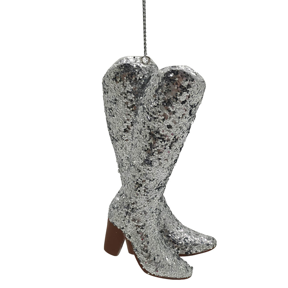 Kurt Adler's Silver Glitter Cowboy Boots Ornament adds elegant sparkle to any holiday or Western-themed décor. Detailed miniature boots shimmer with silver glitter, bringing festive charm and a refined touch to your Christmas tree or mantel. Perfect for those who appreciate Western style with a glamorous twist.