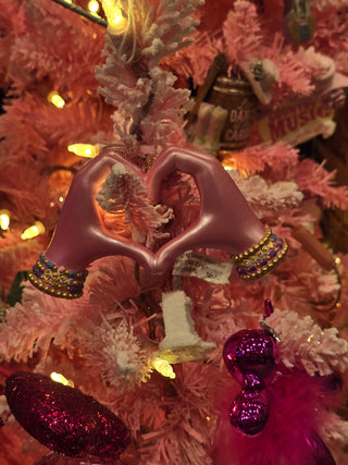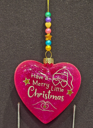 Glass "Have A Merry Little Christmas" Pink Heart With Hanging Beads Ornament T3719 Honky Tonk