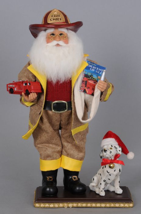 Fire Chief Santa is great for any shelf, mantle, and countertop. The quality is unmatched with this decorative piece's hand-painted face, glass inset eyes, mohair beard, unique fabric, and detailed accessories. With his adorable fireman attire and his original design, he's great as a gift or as a collectible item for your own family and he's sure to add character and style to any home.