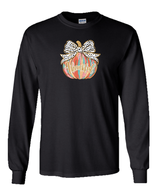 Long Sleeve Tee Soft Thankful Painted Pumpkin with Bow Front Print-Black