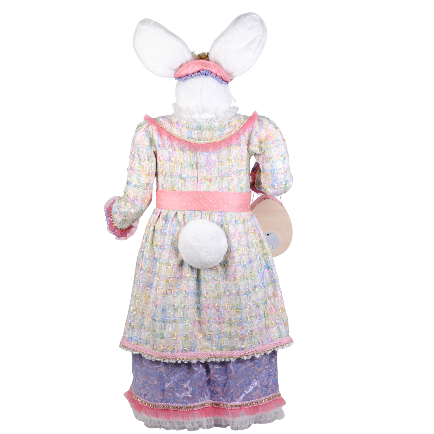 This charming Karen Didion 51" life-size bunny brings springtime magic to your home! Dressed in a pastel coat with delicate ruffles, pearl accents, and a flowing lavender skirt, Marie radiates Victorian elegance. A floral headpiece and golden bow add whimsical touches, while she cheerfully holds a "Hello Spring" sign. Perfect for Easter displays, mantels, or seasonal décor, this enchanting figure combines storybook charm with refined style. Lights up with 2 AA batteries (not included).